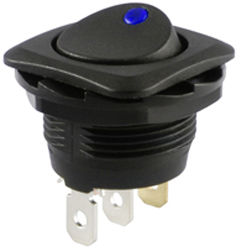 NTE ROCKER SWITCH SPST ON-NONE-OFF ILLUMINATED BLUE DOT 20A 12VDC SQUARE FACE ROUND HOLE .187 INCH TERM PART-NUMBER 54-645-B