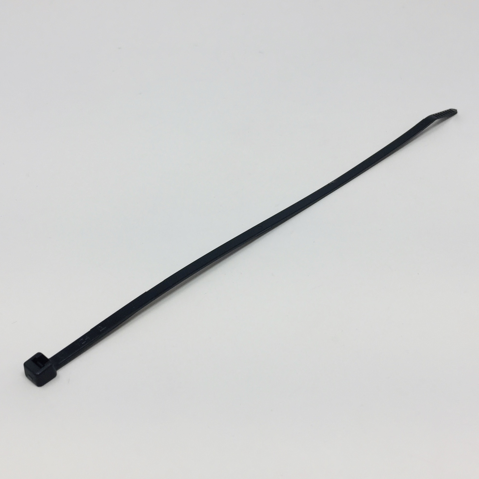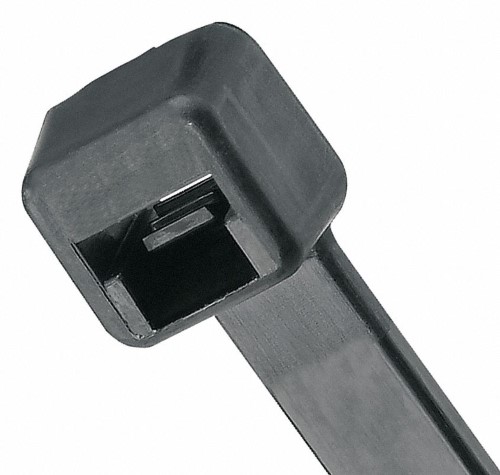 Cable Tie, 8.0 Inches (203 mm) Length, Intermediate, 40 Pounds Minimum Loop Tensile Strength, Weather Resistant Nylon 6.6, Black. Material Flammability Rating of V-2. Weather Resistant material has greater resistance to damage caused by ultraviolet light. Indoor or outdoor use. One-piece construction for consistent performance and reliability. Low thread force. Curved tip is easy to pick up from flat surfaces and allows faster initial threading.