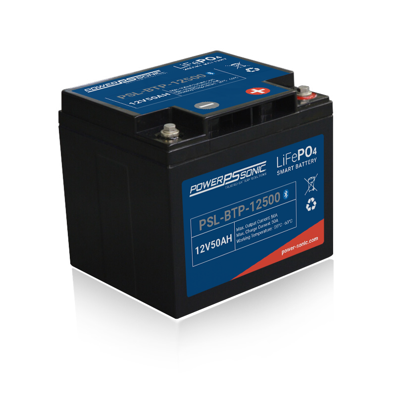 Power Sonic OEM 12.8 Volt 50 Ah High performance Lithium Iron Phosphate (LiFePO4) rechargeable battery with bluetooth communications and integrated battery management system (BMS) with (7.72 x 6.50 x 6.85) Overall Dimensions. and M8 Terminals. Part Number: LIP12500BT Model #: PSL-BTP-12500 M8
