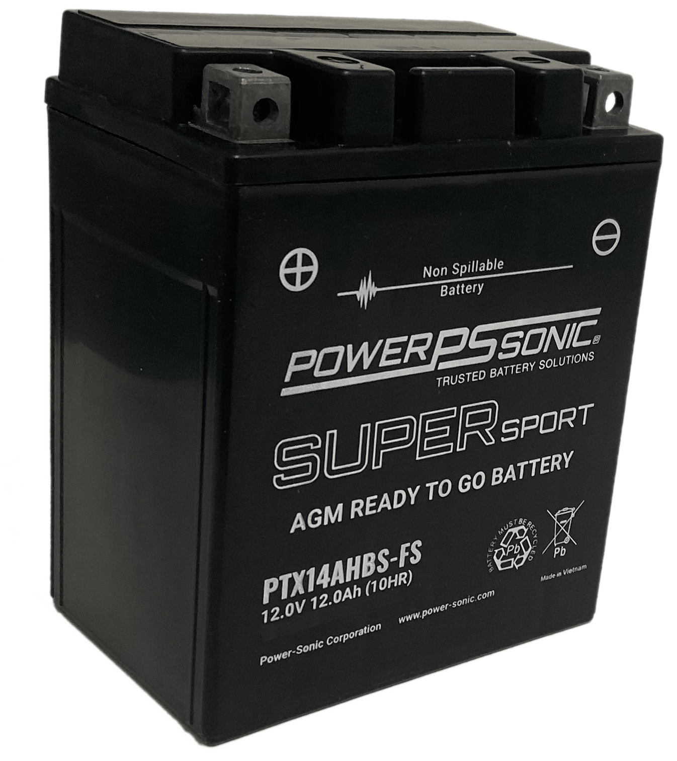 Power Sonic OEM 12 Volt 12 Ah Factory activated Sealed Lead Acid (SLA) Absorbent Glass Mat (AGM) rechargeable Super Sport Powersport battery designed for use with motorcycles, snowmobiles, ATV/UTVs, carts and scooters. with (5.24 x 3.54 x 6.46) Overall Dimensions. and Terminals. Part Number: MC14AH-BS-FS Model #: PTX14AHBS-FS