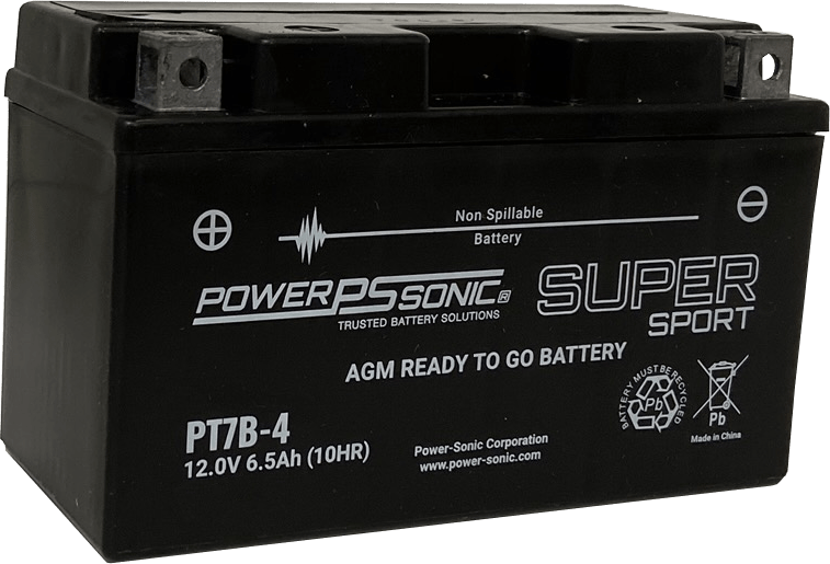Power Sonic OEM 12 Volt 6 Ah Factory activated Sealed Lead Acid (SLA) Absorbent Glass Mat (AGM) rechargeable Super Sport Powersport battery designed for use with motorcycles, snowmobiles, ATV/UTVs, carts and scooters. with (5.91 x 2.60 x 3.66) Overall Dimensions. and Terminals. Part Number: MC7B-4-FS Model #: PT7B-4
