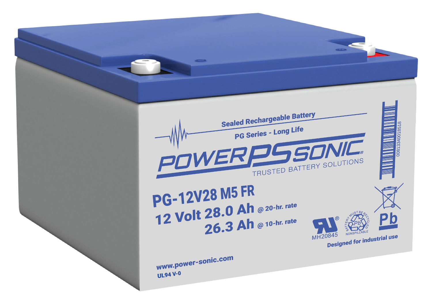 Power Sonic OEM 12 Volt 28 Ah Long Life Sealed Lead Acid Absorbent Glass Mat (AGM) rechargeable VRLA battery. with (6.54 x 6.93 x 4.92) Overall Dimensions. and M5 Terminals. Part Number: 1202808418 Model #: PG-12V28 M5 FR