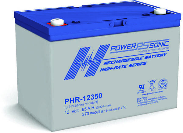 Power Sonic OEM 12 Volt 95 Ah Long Life Sealed Lead Acid Absorbent Glass Mat (AGM) rechargeable VRLA battery. with (12.00 x 6.61 x 8.27) Overall Dimensions. and M6 Terminals. Part Number: HR12350 Model #: PHR-12350 M6 FR