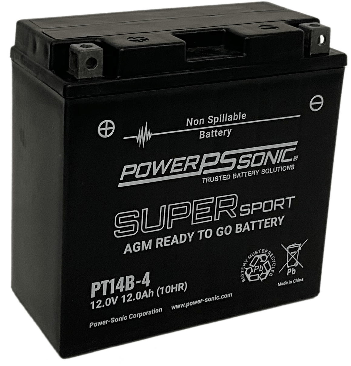 Power Sonic OEM 12 Volt 12 Ah Factory activated Sealed Lead Acid (SLA) Absorbent Glass Mat (AGM) rechargeable Super Sport Powersport battery designed for use with motorcycles, snowmobiles, ATV/UTVs, carts and scooters. with (5.91 x 2.76 x 5.71) Overall Dimensions. and Terminals. Part Number: MC14B-4-FS Model #: PT14B-4