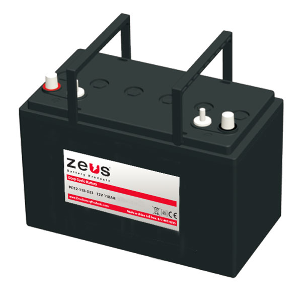 Zeus PC12-118-G31-DT Rechargeable Deep Cycle Battery. Overall dimensions (12.99 x 6.81 x 8.35) Inches @ 69.900 Lbs.