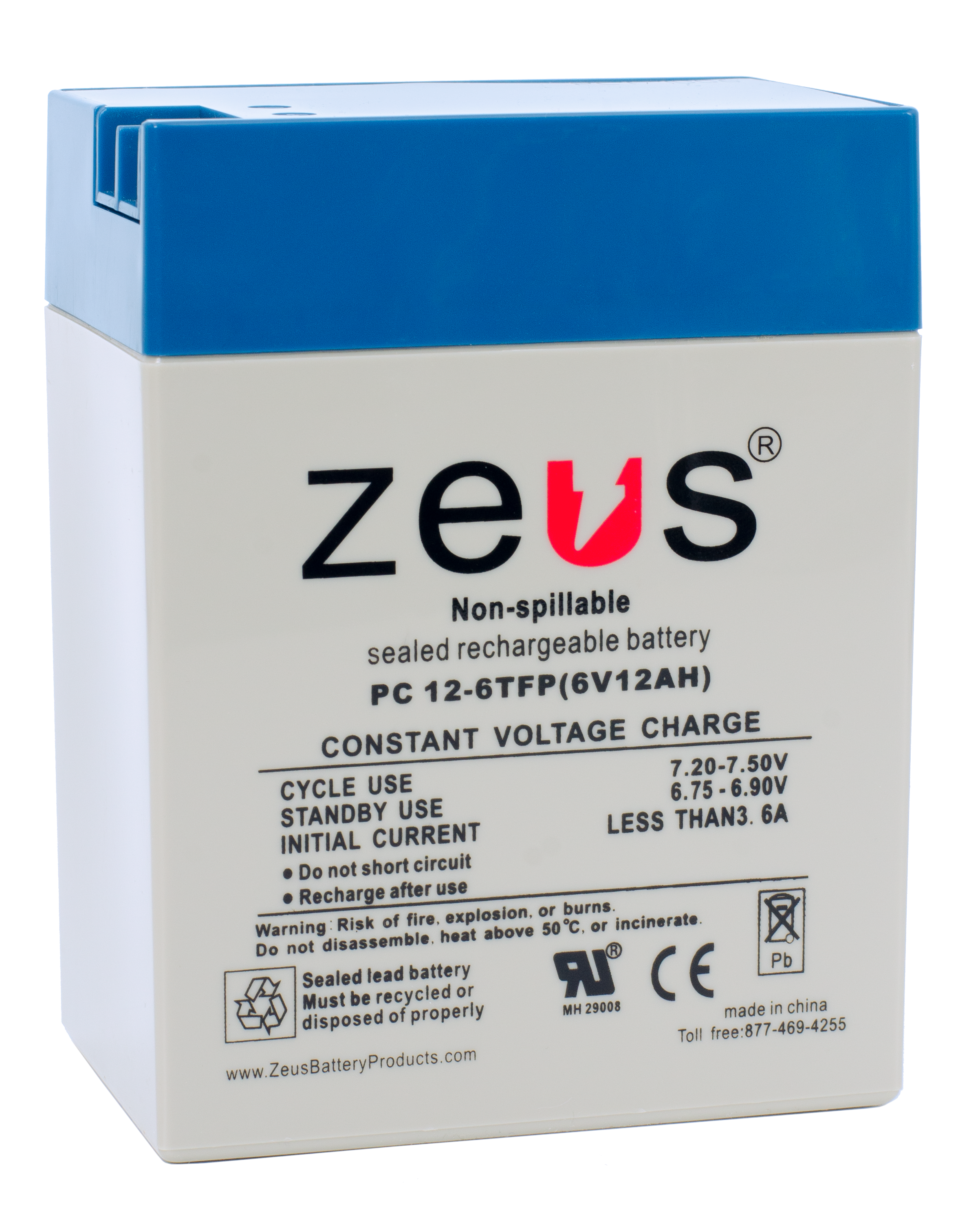 Zeus PC12-6TFP 6V 12aH Rechargable Sealed Lead Acid Battery. Overall dimensions (4.25 x 2.80 x 5.51) Inches @ 4.8 Lbs.