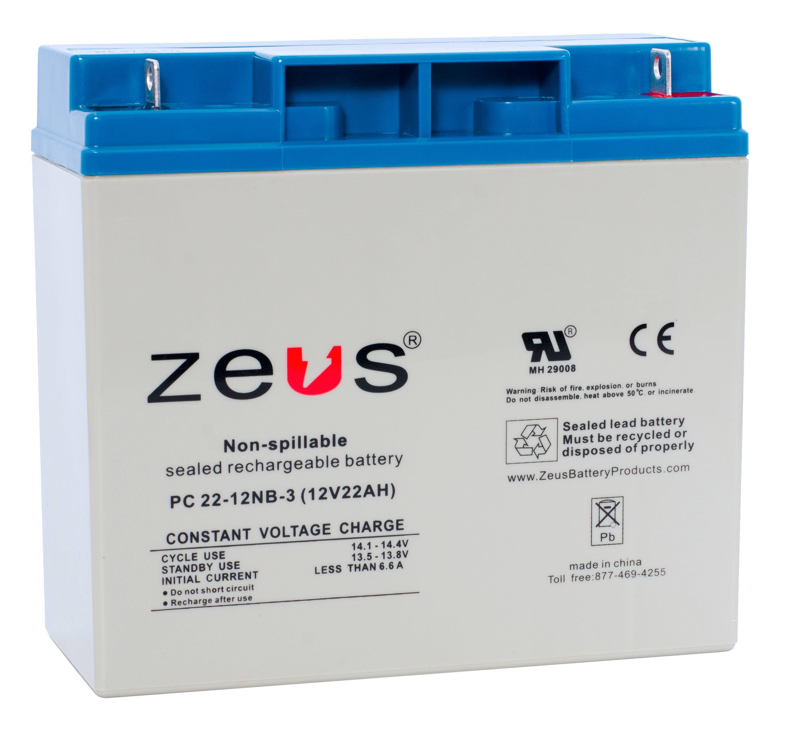 Zeus PC22-12 12V 22aH Rechargable Sealed Lead Acid Battery. Overall dimensions (7.13 x 3.03 x 6.30) Inches @ 14 Lbs.