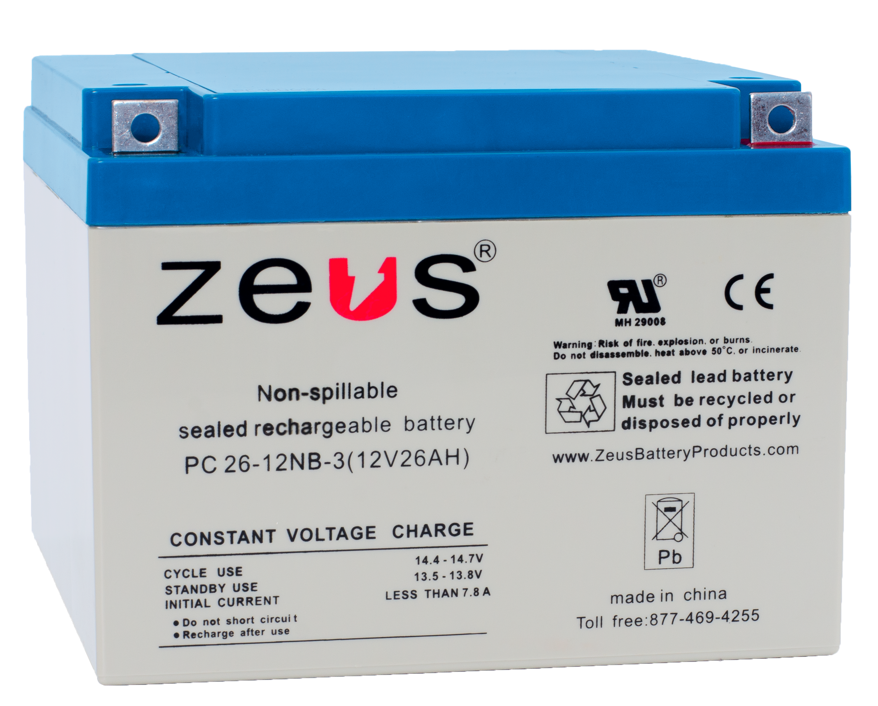 Zeus PC26-12 12V 26aH Rechargable Sealed Lead Acid Battery. Overall dimensions (6.89 x 6.54 x 4.92) Inches @ 16 Lbs.