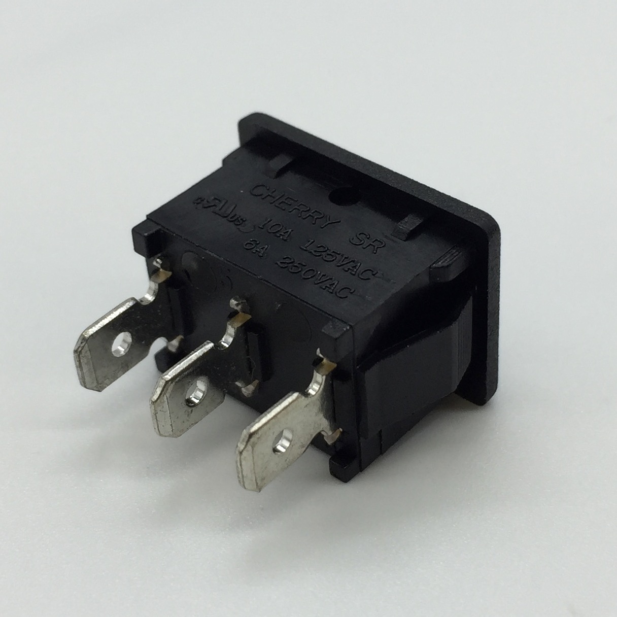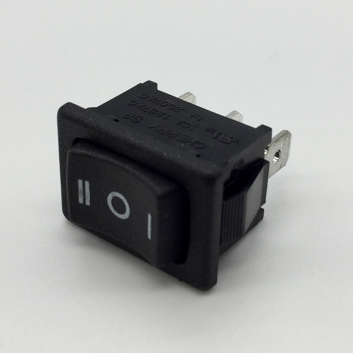 ZF Single Pole On-Off-On Rocker Switch with Curved Black Actuator and I O II (horizontal) markings. Switch has 4.8 mm (.187) Quick Connects Terminals and Black Color Housing