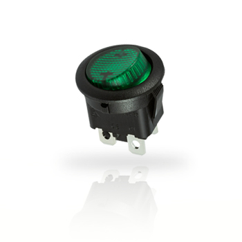 Round 10A Single Pole panel mount switch with 0.187 (4.8) Quick-connect terminals and Black Housing and Red Actuator. Markings are Blank